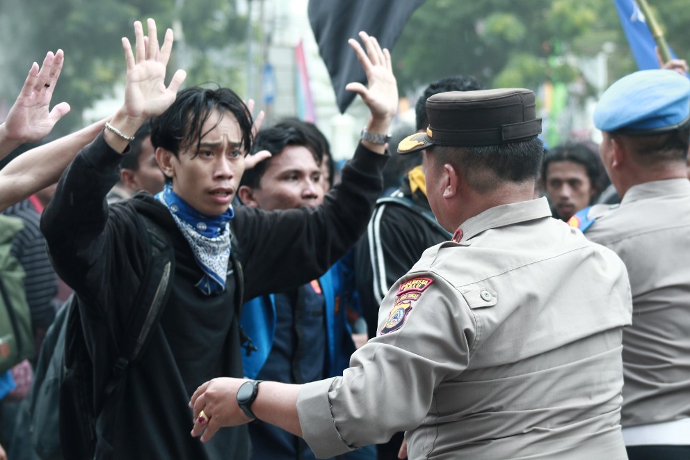 Namun pendemo menolak masuk jika hanya diizinkan sebagian, maka sejumlah pendemo berupaya menerobos masuk dengan merobohkan pagar pintu gerbang gedung tersebut. Massa yang terus berupaya masuk, akhirnya mendapat halangan tembakan water canon dari petugas. Massa aksi pun langsung berhamburan, sebagian ada yang melempar air mineral gelar kearah kerumunan polisi, tetapi kericuhan itu tidak berlangsung lama, karena para koordinator simpul masih dapat menenangkan masing-masing massanya.