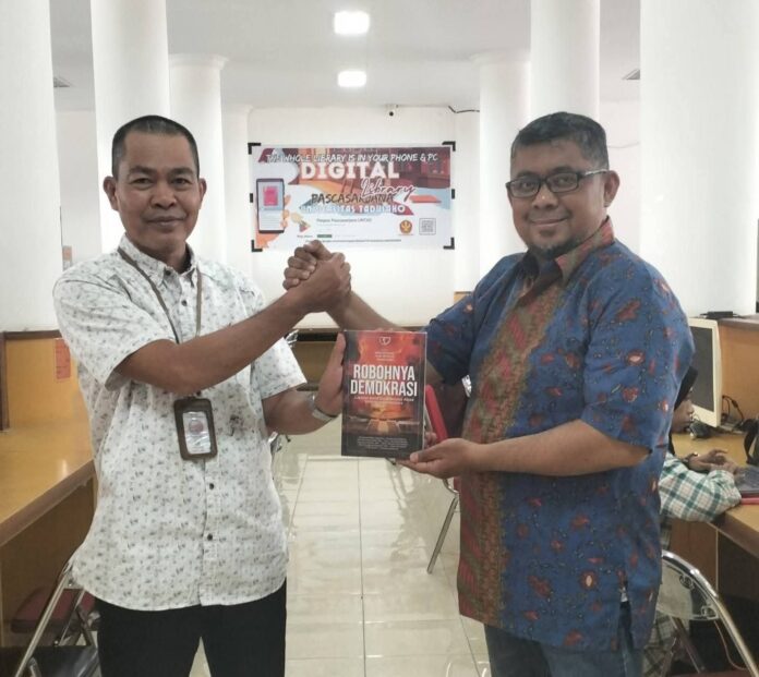 AKTIVI.ID– Dosen Universitas Muhammadiyah (Unismuh) Palu, Dr. Fery, S.Sos., M.Si menyerahkan buku berjudul “Robohnya Demokrasi: Catatan Kritis Seperempat Abad Reformasi Indonesia”, kepada Ketua Forum Perpustakaan Perguruan Tinggi Indonesia (FPPTI) Provinsi Sulawesi Tengah, Dr. H. Saharuddin Lurang, S.Sos, M.Si, Rabu (17/12/2025).