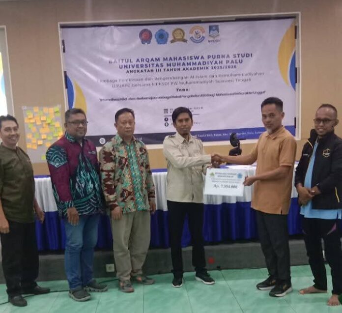 Penyerahan donasi dilakukan secara simbolis oleh Ketua Takmir Masjid Ulil Albab Unismuh Palu, Abdul Mufarik A. Marhum, S.Pd.I., M.Pd kepada Ketua Lazismu Kota Palu, Yulianto, S.Pd.I. Kegiatan tersebut berlangsung di Aula Rektorat Unismuh Palu, bertepatan dengan penutupan kegiatan Baitul Arqam, Sabtu (27/12/2025).