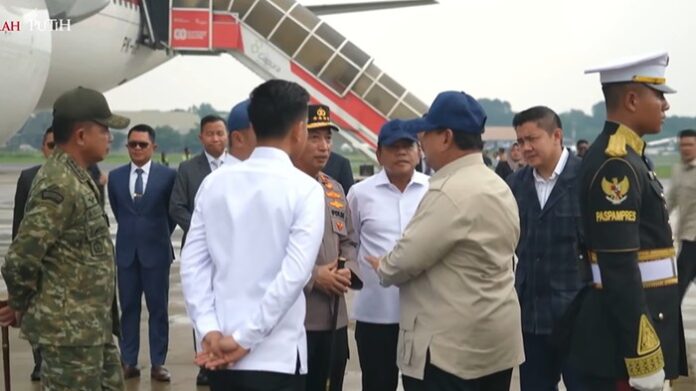 Tampak Wapres Gibran Rakabuming Raka, Mensesneg Prasetyo Hadi, Panglima TNI Jenderal Agus Subiyanto, Kapolri Jenderal Listyo Sigit Prabowo, dan Kepala BIN M Herindra menyambut ketibaan Prabowo di Tanah Air.